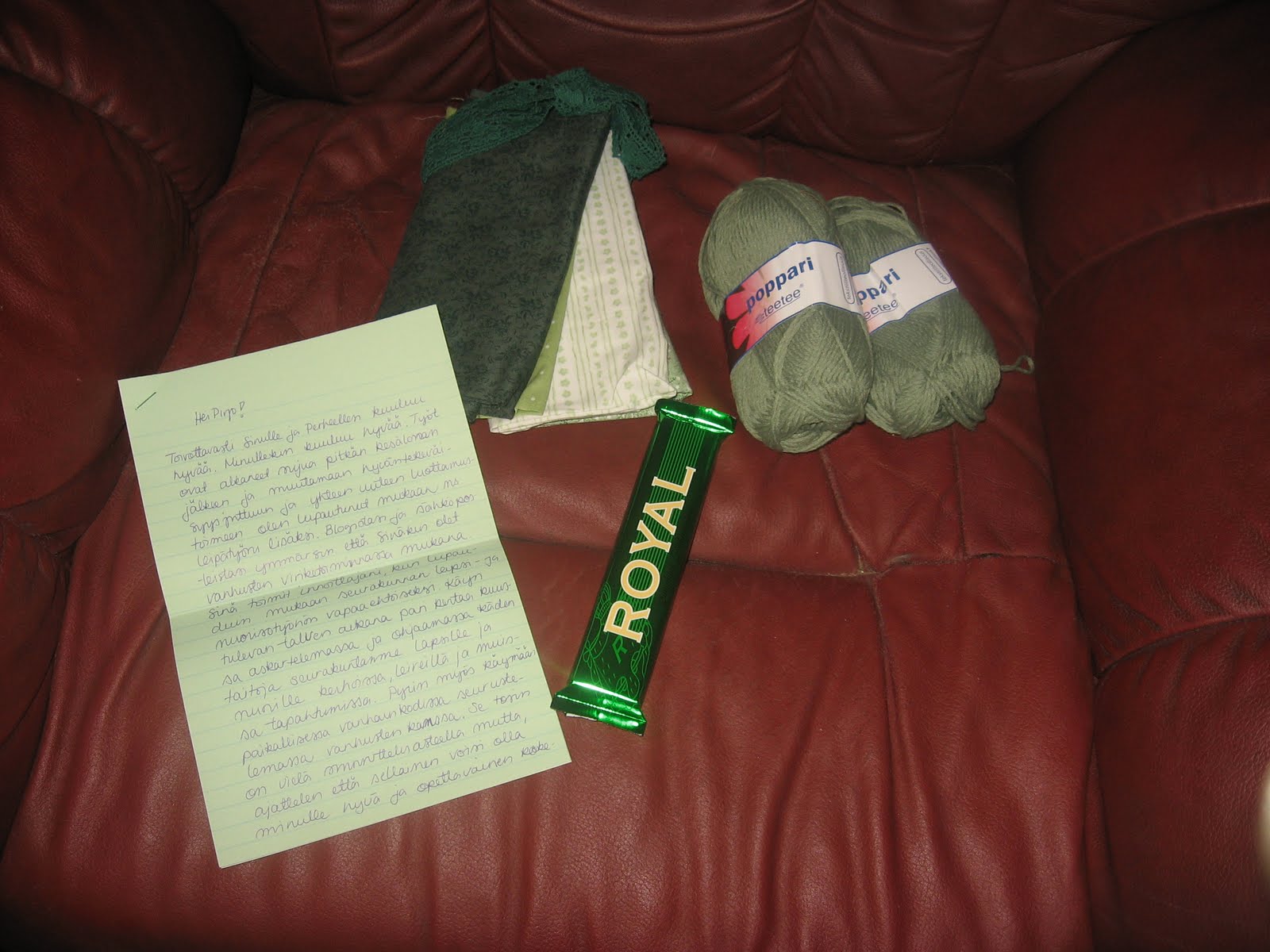 Paketista löytyi ihania kankaita ja pitsiä. Niistä teen kyllä Tildatytölleni vaatteita ja langasta teen ehkä villatakin Tildalleni. Lanka on tosiaan ihanan pehmoista. Ja royalsuklaa on hyvää, juuri nyt syön sitä perjantain kunniaksi. Kiitos myös ihanan pitkästä kirjeestäsi. Tiesitkö, nuorempana minulla oli monta kirjeystävää (nuoria äitejä) joiden kanssa kirjoittelin pitkiä tarinoita. Kun tietokone tuli, niin kirjeenvaihtokin jäi. Kyselit noista pihahommeleista. Tosiaan meillä lehdet maatuu ja keväällä sitten siistimme pihan. Meillä on myös iso vaahterapuu, jonka alla on kasapäin lehtiä, että voisi vaikka uida siinä :) Kiitos sinulle snyyni hirveästi. Tässä paketin sisältö: